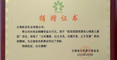 4月29日,云南省工商聯(lián)、云南省光彩事業(yè)基金會(huì)組織了向昆明市延安醫(yī)院“救助先天性心臟病困難患兒項(xiàng)目”捐贈(zèng)儀式,大理州企業(yè)家協(xié)會(huì)理事單位——?dú)W亞乳業(yè)參加儀式并捐款20萬元用于患兒的救助。少年兒童是祖國的未來、民族的希望,歐亞乳業(yè)成立21年來,以捐資助學(xué)為主積極投身社會(huì)公益事業(yè),累計(jì)捐款2000余萬元,切實(shí)為貧困地區(qū)學(xué)校改善教學(xué)和生活環(huán)境提供支持,助力莘莘學(xué)子逐夢(mèng)前行,不負(fù)寒窗,先后被大理州扶貧辦評(píng)為“扶貧助學(xué)愛心企業(yè)”,被大理州工商聯(lián)、大理州光彩事業(yè)促進(jìn)會(huì)評(píng)為“光彩事業(yè)先進(jìn)單位”,被大理市委、市政府評(píng)為“捐