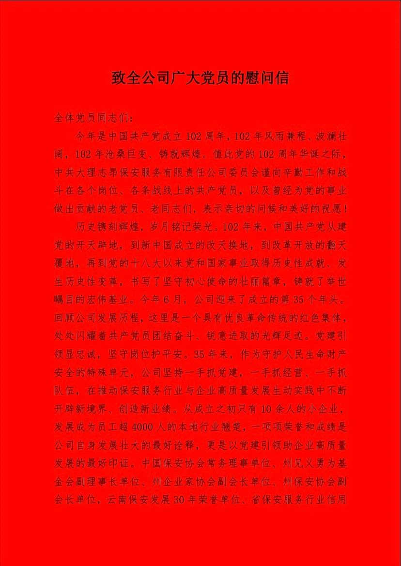 為使廣大基層執(zhí)勤崗位黨員職工深切感受到以習近平同志為核心的黨中央的關懷和溫暖,使慰問的過程成為凝心聚力、振奮精神、推動工作的過程,引導廣大黨員職工開拓進取、奮發(fā)有為,推動保安服務行業(yè)與企業(yè)高質量發(fā)展。7月4日,大理州企業(yè)家協(xié)會副會長單位——大理志昂保安公司黨委在公司黨群活動中心組織召開慶祝中國共產黨成立 102 周年系列活動暨慰問一線崗位黨員座談會。公司黨委書記劉志杰、在家的班子成員出席座談會,保安員、消防員、警務輔助人員等30名來自一線崗位的黨員代表參加座談會。
