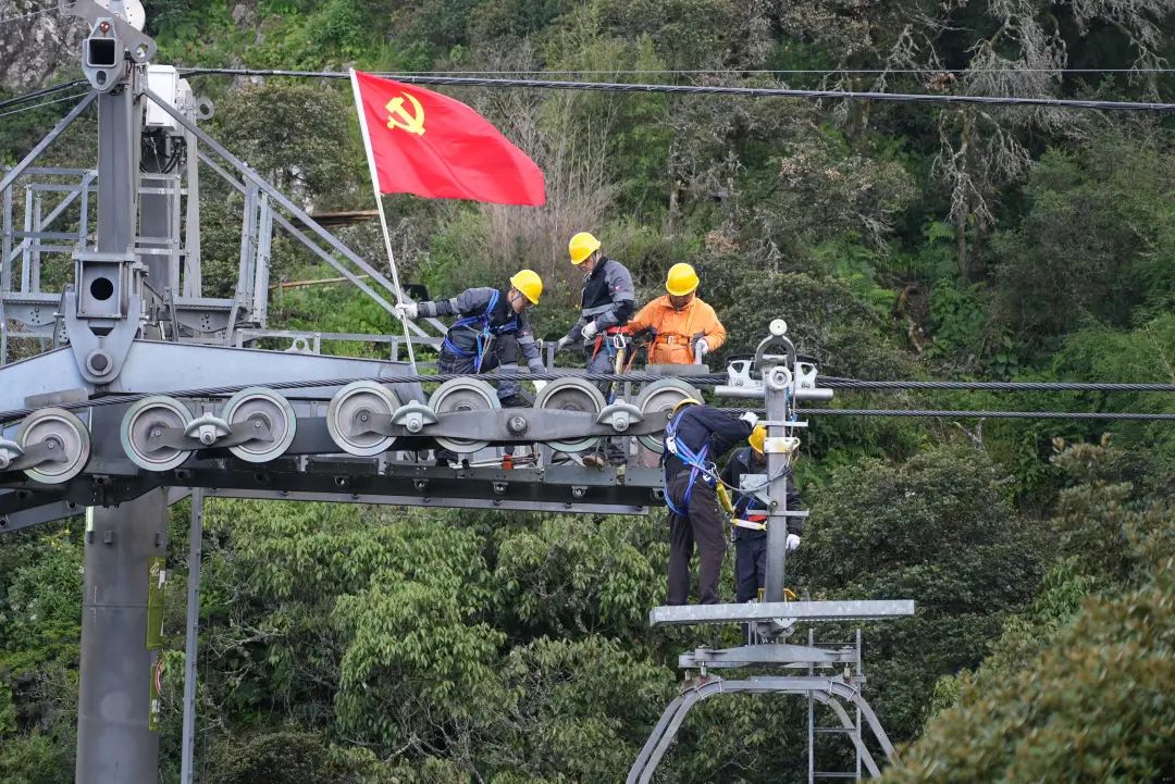 一面鮮紅的黨旗迎風飄揚在大理州企業家協會副會長單位——大理旅游集團下屬的賓川雞足山索道34米高的支架上,旁邊五六個檢修師傅正在認真細心地進行著索道更換支架輪襯及潤滑保養工作……