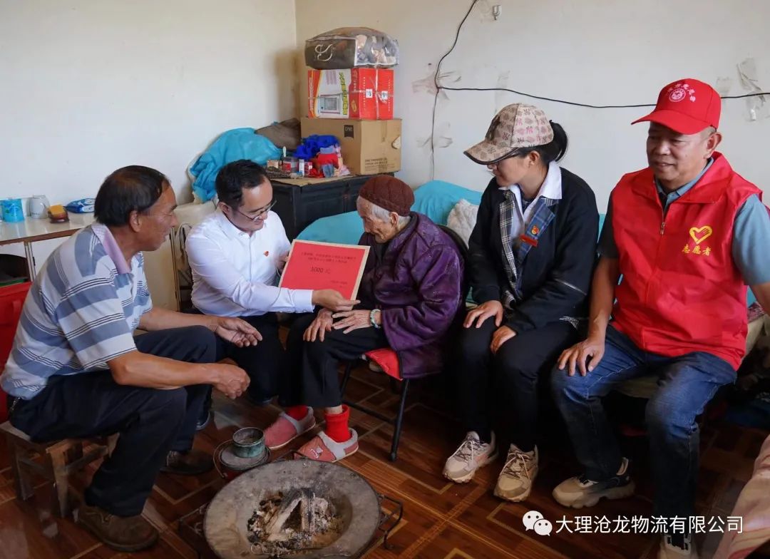 活動中,大理滄龍物流有限公司代表和太邑鄉政府領導、者摩村委會領導等一同看望慰問了村里的百歲老人。大家在老人家中,與老人面對面交流,嘮家常,仔細了解老人的身體狀況和生活情況。