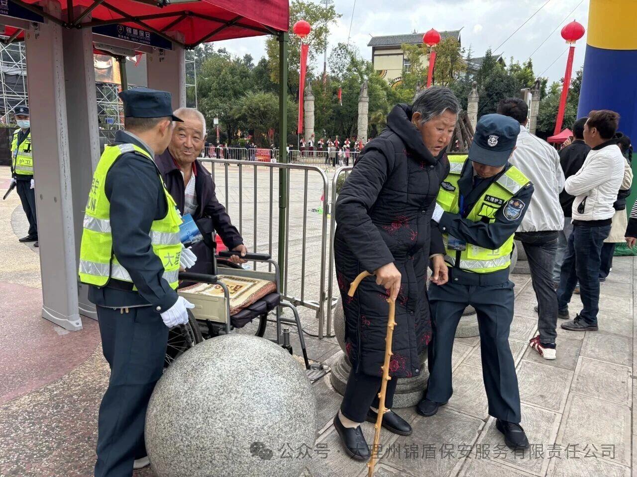 慶祝大會當天,錦盾執勤人員凌晨集合、提前到達,按照各崗位預定方案迅速投入工作。在主要入口的安檢點,安檢隊員們熟練操作專業設備,對每一位入場人員及隨身物品進行細致檢查。他們不斷重復著規范的引導動作,口中說著“請您抬手配合一下安檢”、“謝謝您的合作”,在確保安全的同時,也最大限度加快了通行效率,避免了入口處的擁堵。在長達數小時的勤務中,全體執勤人員始終保持著高度的警惕性和良好的精神風貌,即使汗水浸透了制服,依然身姿挺拔,文明執勤。更令人感動的是,執勤過程中涌現出許多體現人文關懷的瞬間:一名觀眾不慎遺失裝有重要證件的手提包,焦急萬分,巡邏隊員通過多方詢問和排查,最終在失物招領處為其尋回;部分老年參會群眾行動不便的,執勤人員主動提供幫扶,協助其上下臺階、尋找休息座椅......這些看似微小的善舉,卻如涓涓細流,匯聚成暖心的海洋,生動展現了錦盾保安員“安全守護者”與“溫情傳遞者”的雙重角色,贏得了現場群眾的頻頻贊許。