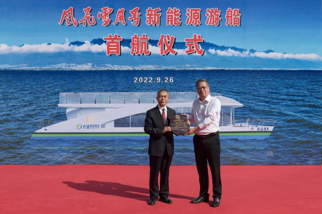 大理州人民政府副州長魯旭俊主持了“風花雪月號”新能源游船首航儀式,中國船籍社重慶分社處長潘斌為“風花雪月號”授牌,大理旅游集團黨委副書記、總經理唐輝接牌。