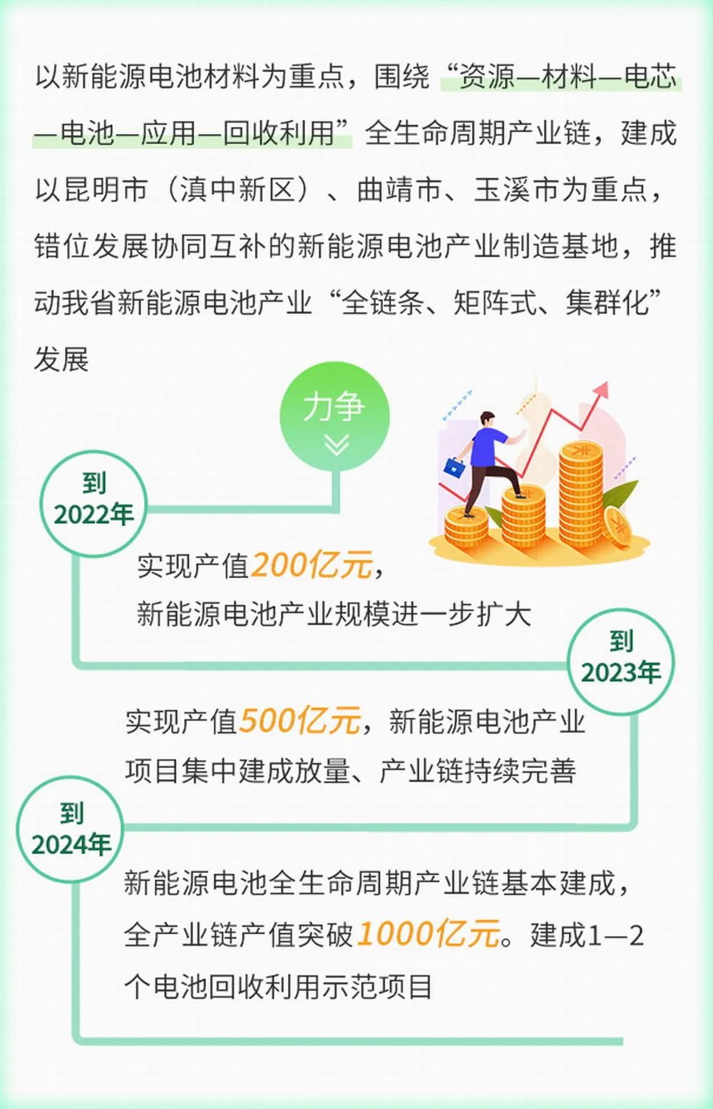 據(jù)近期《昆明市新能源電池產(chǎn)業(yè)發(fā)展三年行動方案(2022-2024年)(送審稿)》顯示,昆明通過發(fā)展新能源電池全生命周期產(chǎn)業(yè)鏈,到2022年、2023年新能源電池產(chǎn)業(yè)總產(chǎn)值力爭實現(xiàn)100億元和500億元,到2024年突破1000億元,建成全國最大的鋰離子電池正級材料生產(chǎn)基地和西南最大的鋰離子電池負(fù)級材料生產(chǎn)基地。