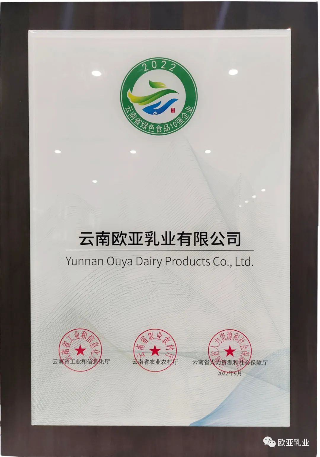 歐亞乳業再登云南省綠色食品“10強企業”榮譽殿堂