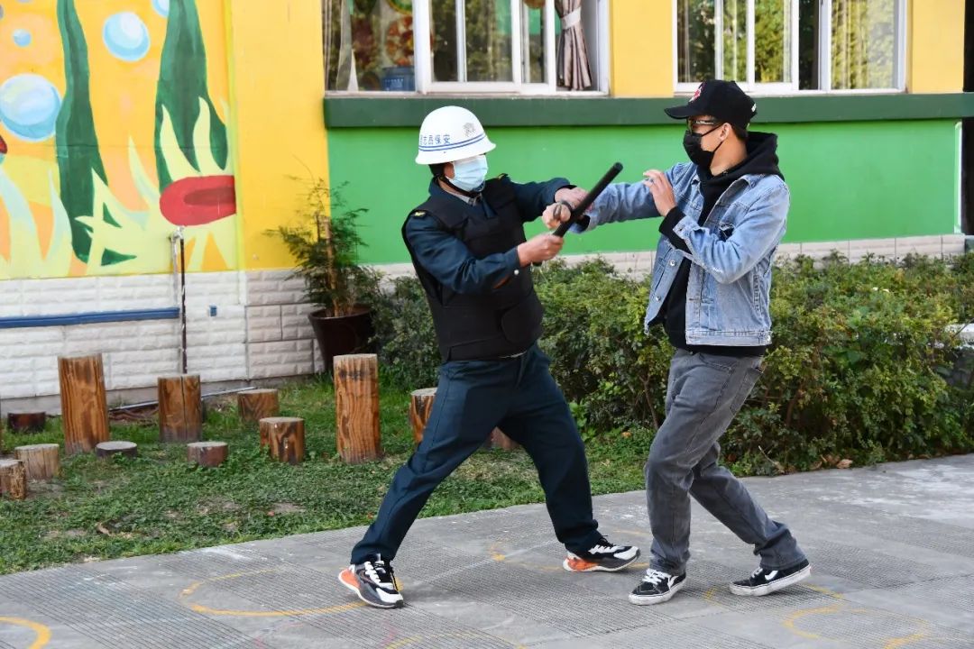 在保安員詢問情況登記相關(guān)信息時(shí),“歹徒”突然拿出兇器,意圖強(qiáng)行闖入幼兒園。