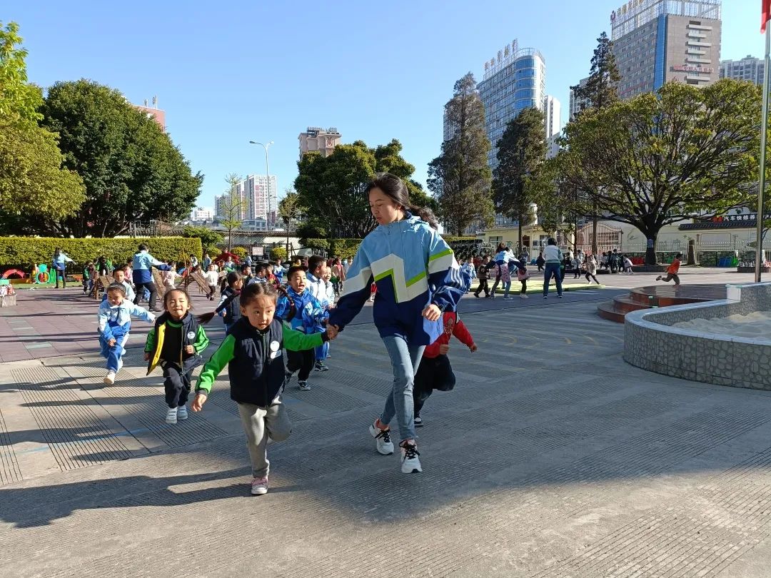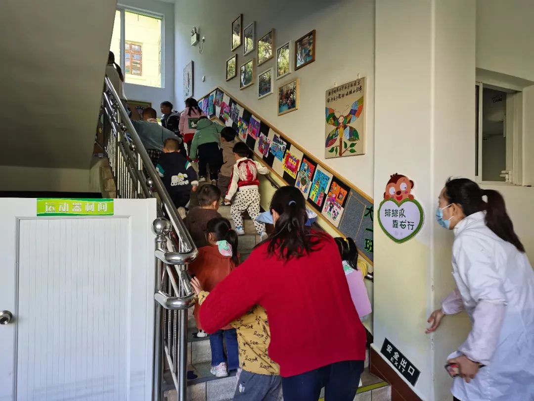 戶外活動(dòng)的幼兒由教師組織迅速撤離操場(chǎng),往教室方向跑。