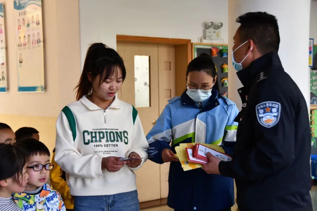 民警叔叔給小朋友講解防恐的知識(shí)。
